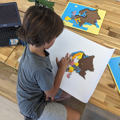 As they “traveled,” Eagles took on a series of mini-challenges called voyages, designed to sharpen their cartography skills and deepen their understanding of geography. These tasks encouraged creativity, curiosity, and critical thinking. Using Montessori map materials, each Eagle selected a continent and drew their own map, showcasing what they had learned.